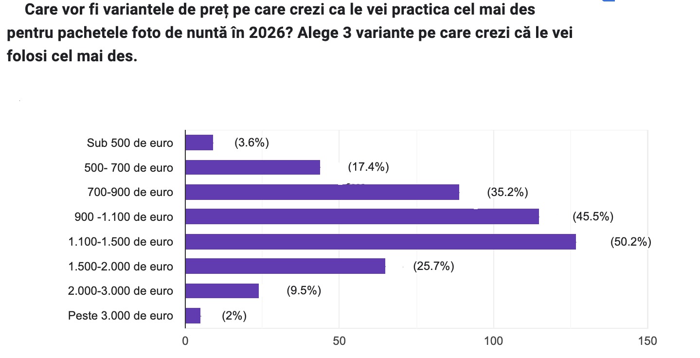 Fotografii cred că pachetele pe care le vor vinde cel mai des în 2026 sunt cele între 1.100 – 1.500 EUR (50,2% dintre opțiuni), cele între 900 și 1.000 EUR (45,5%) și cele între 700 și 900 EUR (35,2%), arată datele colectate de Fotografi-Cameramani.ro, platformă care reunește fotografi, cameramani și videografi pentru nunți și botezuri.